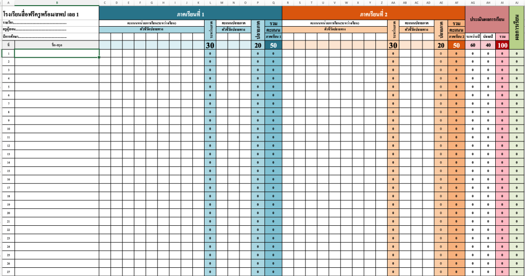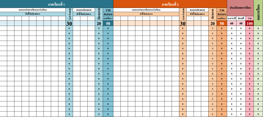 แบบบันทึกคะแนนผลการเรียน ล่าสุด ตัวชี้วัดปลายทาง ระหว่างทาง พร้อมตัดเกรด