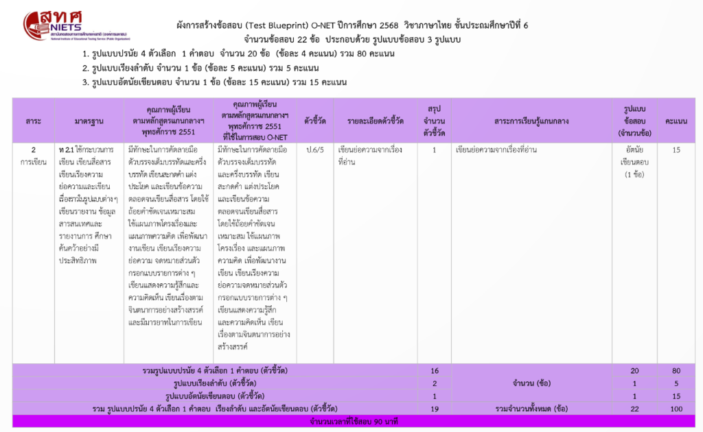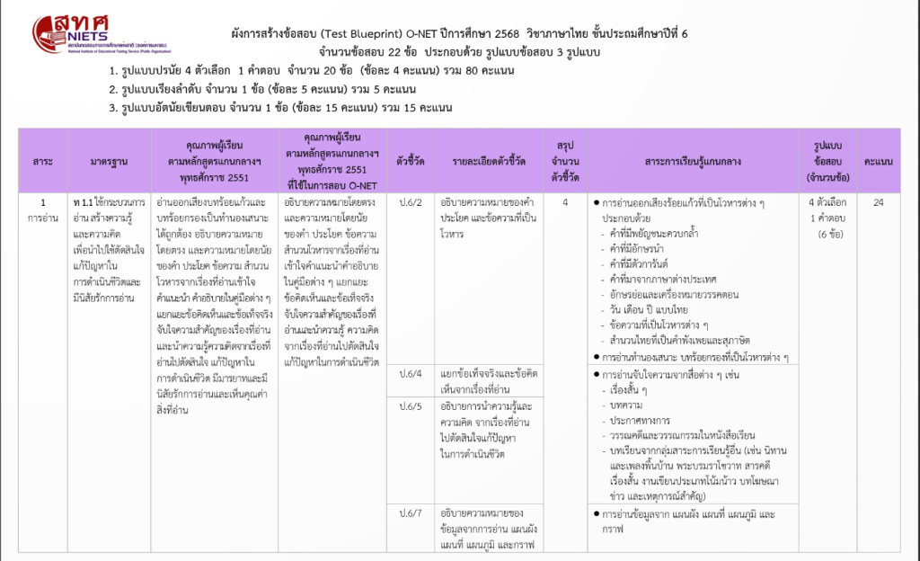 📝 ผังการสร้างข้อสอบ O-NET ป.6 ปีการศึกษา 2568