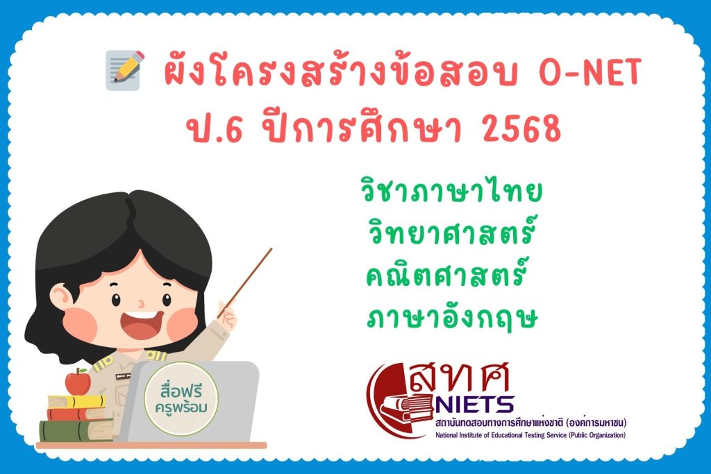 การทดสอบทางการศึกษาระดับชาติขั้นพื้นฐาน (O-NET) ระดับชั้น ประถมศึกษาปีที่ 6 ปีการศึกษา 2568 ได้มีการกำหนด ผังการสร้างข้อสอบ (Test Blueprint) อย่างชัดเจนในแต่ละกลุ่มสาระ เพื่อให้การวัดผลเป็นไปตามมาตรฐานการเรียนรู้และตัวชี้วัดที่กระทรวงศึกษาธิการกำหนด โดยเน้นวัด ความรู้ ความเข้าใจ และทักษะการคิดวิเคราะห์ ของผู้เรียนในภาพรวม